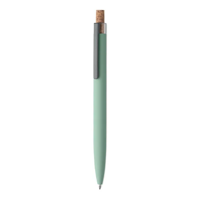 Шариковая зеленая ручка из переработанного алюминия с пробковой кнопкой и металлическим зажимом.