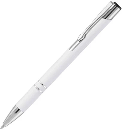 Элегантная белая металлическая ручка с хромированными элементами и цветным корпусом. Бархатистое и не скользящее покрытие «софт тач» придает особый шик этой популярной модели. Роскошные матовые цвета станут отличным фоном для логотипа.