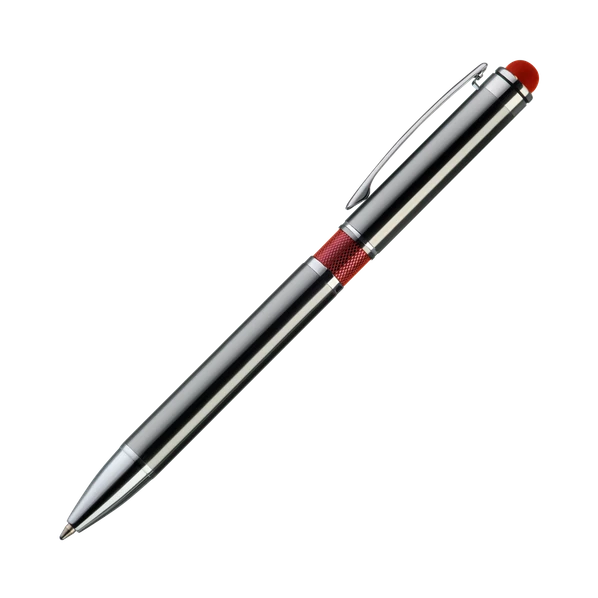 Классическая красная ручка цвета металлик с цветными деталями. Оснащена стилусом для работы с сенсорными экранами.