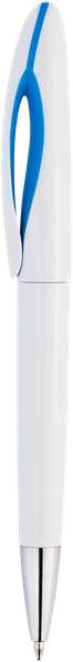 Классическая бело-голубая шариковая ручка Oko. Пластиковый эргономичный корпус с матовым хромированным наконечником. Заменяемый стержень. Обращаем внимание, что при открытии ручки механизм не поворачивается на 90 градусов!