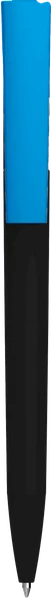 Черно-голубая ручка оснащена сменным стержнем Х20 синего цвета с диаметром 1 мм. Конструкция не фиксирует поворотный механизм под углом 90 градусов, поэтому при открытии положение корпуса и клипа может отличаться. Это важно учитывать при нанесении логотипа: в закрытом положении он не будет находиться строго напротив клипа.