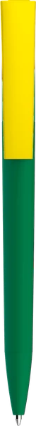 Зелено-желтая ручка оснащена сменным стержнем Х20 синего цвета с диаметром 1 мм. Конструкция не фиксирует поворотный механизм под углом 90 градусов, поэтому при открытии положение корпуса и клипа может отличаться. Это важно учитывать при нанесении логотипа: в закрытом положении он не будет находиться строго напротив клипа.