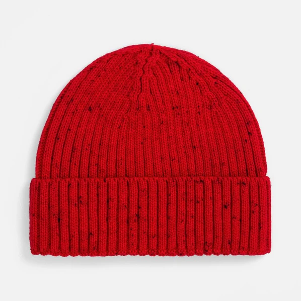 Красная шапка-бини с отворотом выполнена крупной резинкой из мягкой акриловой пряжи, которая создает дополнительный объем и хорошо сохраняет тепло. Благодаря оригинальному дизайну она позволит создать запоминающийся образ со стильным и лаконичным акцентом.