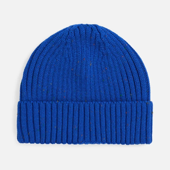 Синяя шапка-бини с отворотом выполнена крупной резинкой из мягкой акриловой пряжи, которая создает дополнительный объем и хорошо сохраняет тепло. Благодаря оригинальному дизайну она позволит создать запоминающийся образ со стильным и лаконичным акцентом.