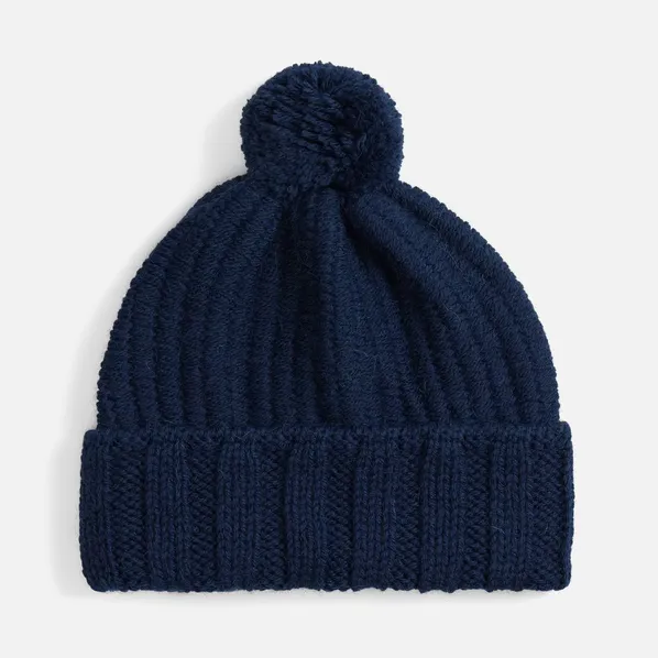 Однослойная темно-синяя шапка Frissonelle из полушерстяной пряжи рельефной вязки сохраняет тепло без лишней тяжести.
