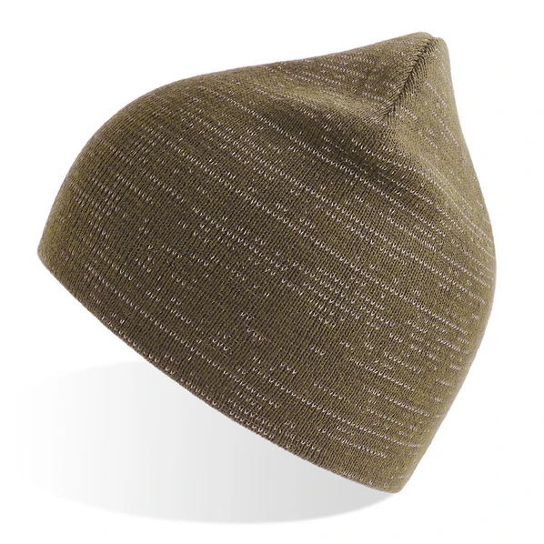 Современная шапка оливкового цвета Shine из переработанного полиэстера и акрила. Модель содержит специальные светоотражающие нити для безопасного передвижения ночью!