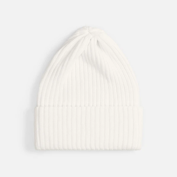 Стильная белая шапка для тех, кто предпочитает держать уши в тепле — 3 слоя трикотажа точно не дадут им замерзнуть. Однослойная шапка фактурной вязки с двойным отворотом.