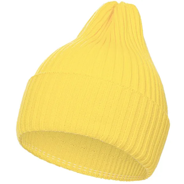 Стильная светло-желтая шапка для тех, кто предпочитает держать уши в тепле — 3 слоя трикотажа точно не дадут им замерзнуть. Однослойная шапка фактурной вязки с двойным отворотом.