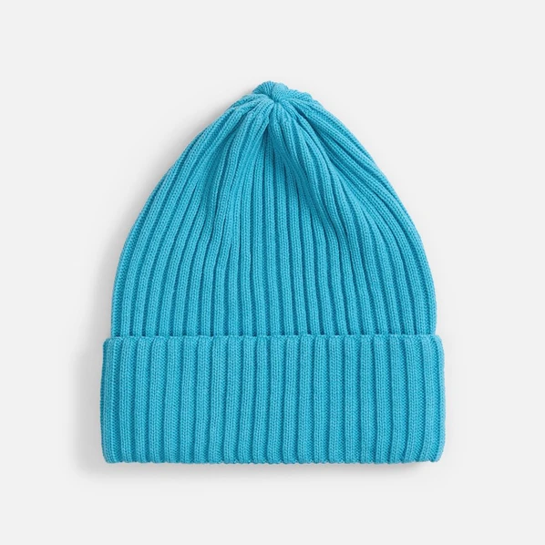 Стильная ярко-голубая шапка для тех, кто предпочитает держать уши в тепле — 3 слоя трикотажа точно не дадут им замерзнуть. Однослойная шапка фактурной вязки с двойным отворотом.
