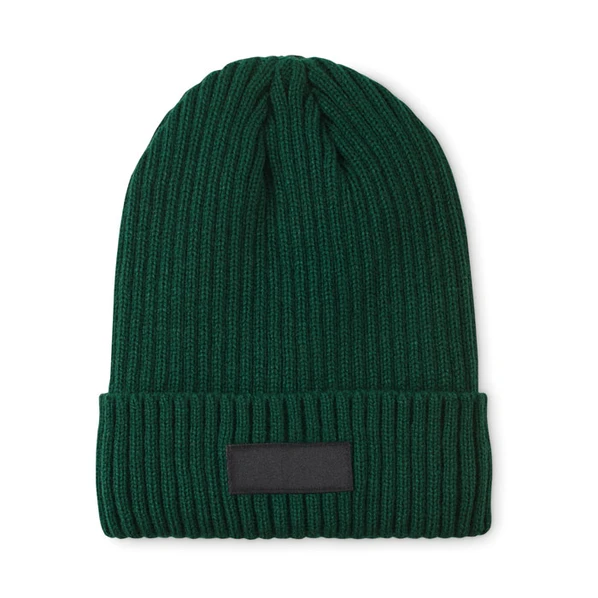 Вязаная зеленая шапка из акрила снаружи и полиэстера внутри с утеплителем 3M и манжетом.