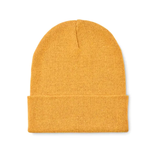 Эластичная желтая вязаная шапка из мягкого полиэстера (64%) и акрила (36%) с манжетом.