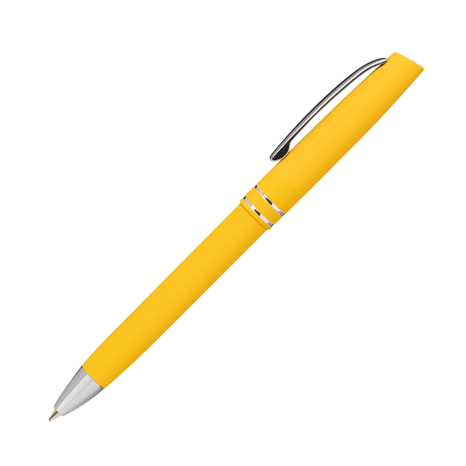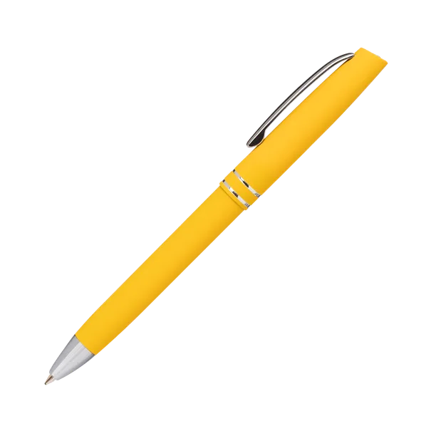 Шариковая желтая ручка с нажимным механизмом и покрытием Soft Touch, которую приятно держать и использовать.