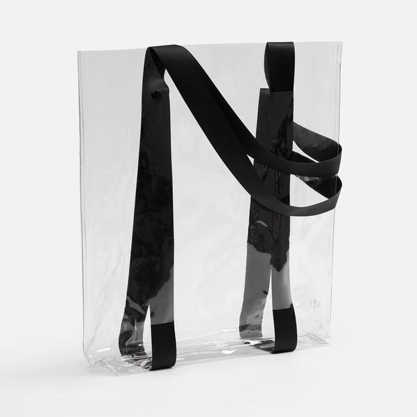 Прозрачные сумки никогда не выйдут из моды. А черные ручки легко впишутся в брендбук и точно передадут настроение, которое хотелось бы транслировать.