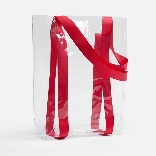 Прозрачные сумки никогда не выйдут из моды. А красные ручки легко впишутся в брендбук и точно передадут настроение, которое хотелось бы транслировать.