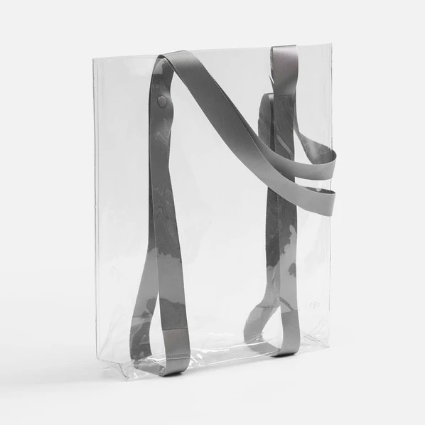 Прозрачные сумки никогда не выйдут из моды. А серые ручки легко впишутся в брендбук и точно передадут настроение, которое хотелось бы транслировать.