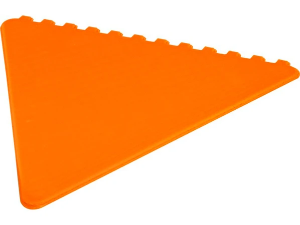 Треугольный скребок оранжевого цвета для удаления льда с лобового стекла, имеющий большую площадь для декорирования. Сделано в Великобритании из переработанного полистирольной пластмассы.