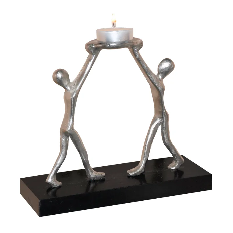Скульптура-подсвечник «Единство» выполнена в черно-серебристом цвете. Постамент изготовлен из дерева, а сама скульптура - из металла.