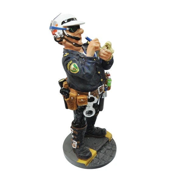 Скульптура «Полицейский» изготовлена из полистоуна. Изображает офицера полиции в темно-синей униформе, белом шлеме и с желтым блокнотом. Фигурка отличается отличной проработкой деталей, множеством мелких подробностей. Поставляется в подарочной коробке, имеет свою историю, рассказанную во вкладыше.