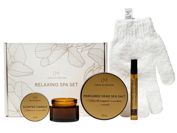 Relaxing Spa Set от Lights of Moscow подарит хорошее настроение и заряд бодрости, а также послужит полезным подарком для ваших родных, близких, друзей и коллег. SPA -набор снимет стресс, поможет восстановить внутреннюю гармонию и позволит окунуться в мир ароматов селективной парфюмерии. Каждый продукт в наборе создан по мотивам современных веяний в перфорированном искусстве.