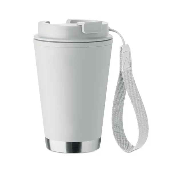 Стильный белый стакан с двойными стенками, внутренняя стенка из полипропилена, внешняя стенка из переработанного полипропилена, детали из переработанной нержавеющей стали и ремешок на запястье из полипропилена.