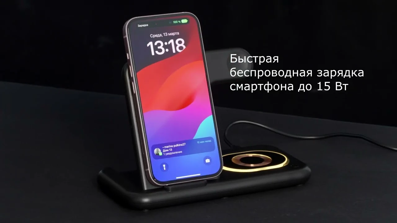 Беспроводная черная зарядная станция на 3 устройства MajestiQ с прогрессивным дизайном: модуль беспроводной зарядки в вертикальном сегменте станции может менять свое положение по принципу слайдера. Это позволяет настроить положение под размер любого смартфон, не снимая чехла. На станции можно заряжать три беспроводных устройства одновременно: смарт-часы Apple, смартфон и беспроводные наушники. Вместо наушников можно расположить для зарядки второй смартфон. MajestiQ поддерживает быструю беспроводную зарядку 15 Вт.
