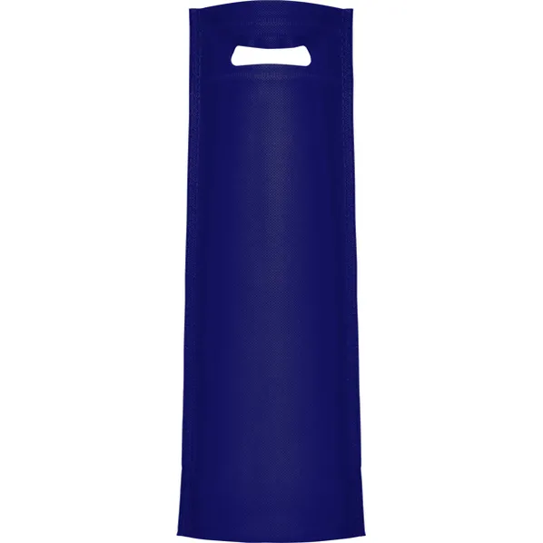 Термосклееная синяя сумка, специально для бутылок с донной складкой, выполнена из нетканого материала с прорубной ручкой.