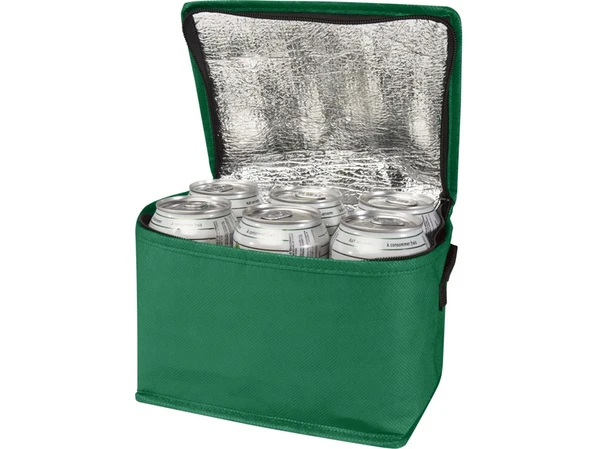Сделанная из прочного и стойкого к разрывам нетканого RPET, зеленая сумка-холодильник Spectrum на 6 банок, изготовленная из переработанных материалов, подходит для хранения до 6 банок и оснащена удобной для переноски ручкой из тесьмы.