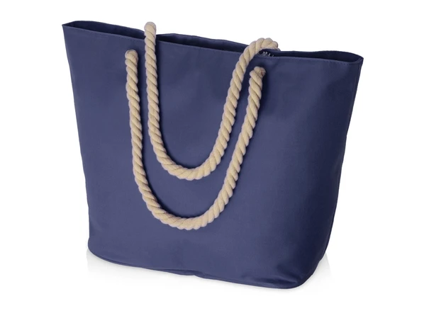 В легкую и вместительную пляжную сумку синего цвета с широким дном можно сложить все необходимое для комфортного отдыха.