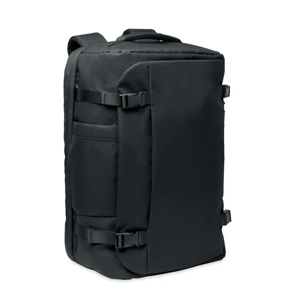 Большой дорожный черный рюкзак для ноутбука 17 дюймов из полиэстера 600D RPET. Имеет несколько отделений, в том числе основное для одежды и два с мягкой подкладкой для ноутбука и планшета.