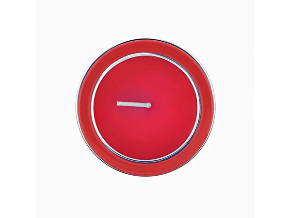 Ароматическая красная свеча Flake с запахом ванили в металлическом круглом подсвечнике с крышкой с прозрачным окошком. Цвет свечи в тон подсвечника.