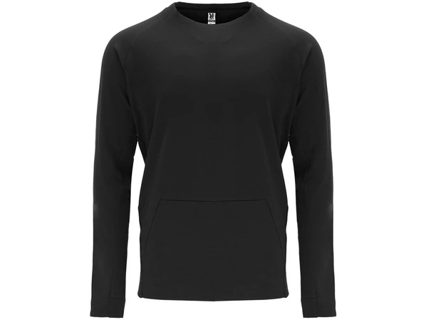Стильный черный свитшот Roly Mana с рукавом реглан. Горловина спинки и боковая часть манжет из риба 1х1. Карман кенгуру, диагональные боковые швы с наклонам к центру переда.