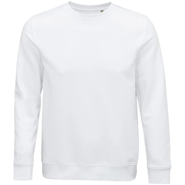 Белый свитшот унисекс из органического хлопка с круглым вырезом и втачным рукавом. Манжеты и низ изделия выполнены резинкой 2х2. Лейбл производителя в боковом шве изнутри, в шве горловины — только бирка с размером, что позволяет вам нанести свой логотип.
