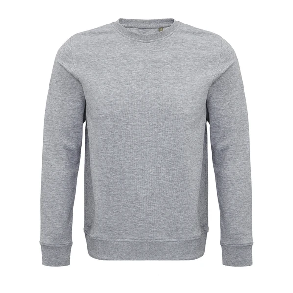 Свитшот серого цвета без начеса выполнен из 80% органического хлопка и 20% переработанного полиэстера, плотностью 280 г/м2.