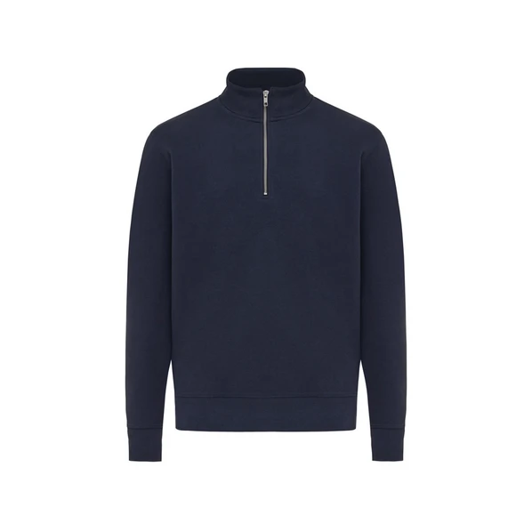 Темно-синий свитшот на молнии выполнен из 100% хлопка, который на 30% состоит из переработанного и на 70% из органического. Воротник-стойка, втачные длинные рукава и резинка по манжетам и низу.