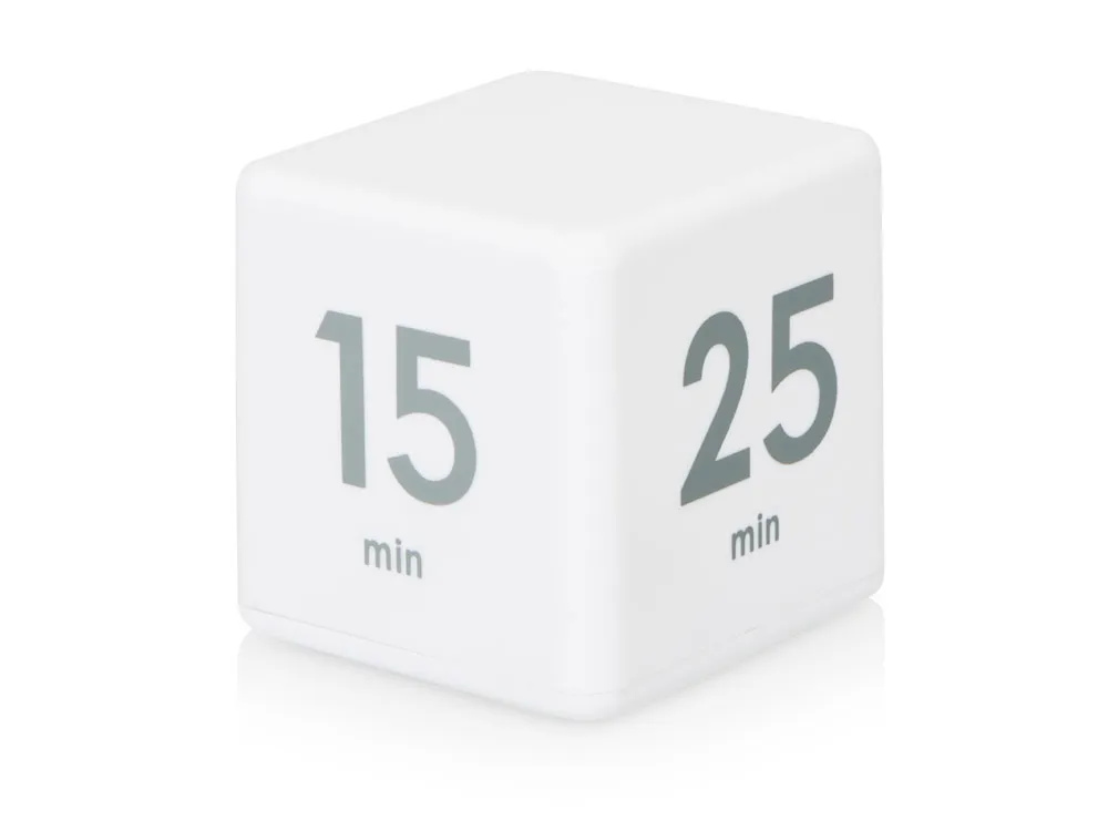 Ваш идеальный помощник дома и на работе - цифровой таймер в виде кубика. На сторонах куба напечатаны четыре предустановленных времени обратного отсчета (5, 15, 25 и 45 минут). Просто включите таймер и поверните его нужной цифрой наверх для начала отсчета времени. Когда время закончится, раздастся звуковой сигнал.