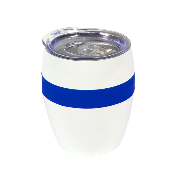 Бело-синяя термокружка Line с двойными стальными стенками сохранит напиток горячим до 3х часов. Объем изделия составляет 300 мл. Благодаря форме удачно лежит в руке, и за счет резинового браслета не скользит.