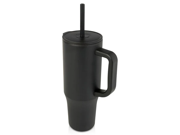 Экологичная черная термокружка с прочной внешней стенкой из сертифицированной RCS переработанной нержавеющей стали и внутренней стенкой из пластика. В комплект входит встроенная соломинка из пищевого силикона и герметичная крышка с защитой от брызг для комфортного питья.