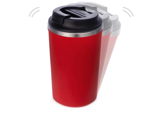Стильная красная термокружка «Kick» отлично подойдет для повседневного использования как на работе, так и дома. Термокружка надежно крепится к столу за счет присоски на дне, что исключает падения при случайном задевании. Чтобы воспользоваться кружкой, ее нужно поднять вертикально.