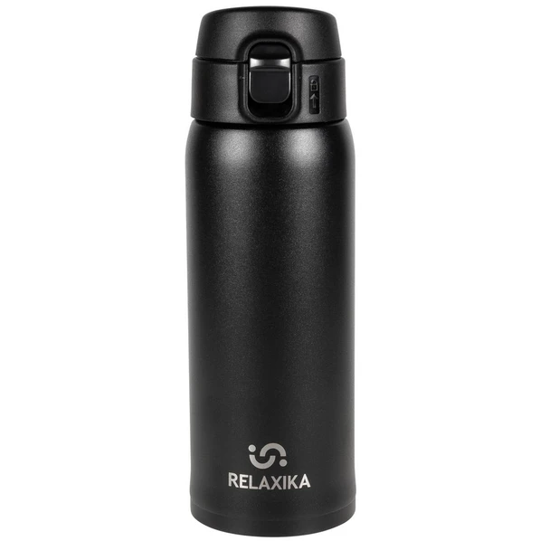Практичная черная термокружка Relaxika. Термокружку легко открыть одной рукой, что особенно удобно в машине и на улице. Дополнительный фиксатор на крышке предотвратит случайное проливание напитка.