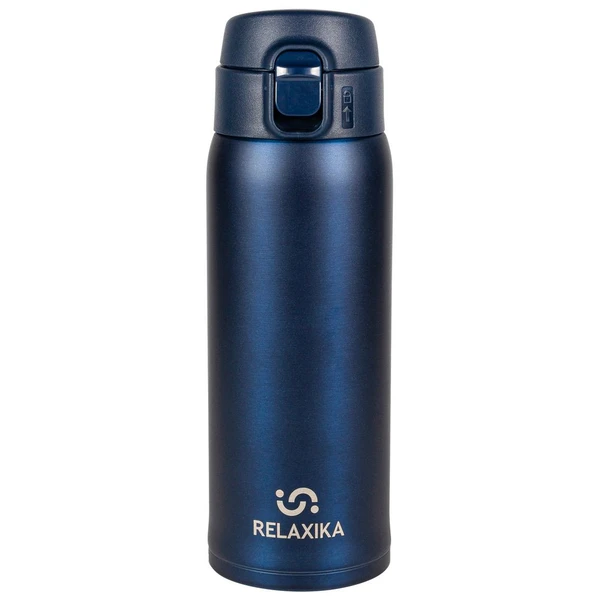 Практичная синяя термокружка Relaxika. Термокружку легко открыть одной рукой, что особенно удобно в машине и на улице. Дополнительный фиксатор на крышке предотвратит случайное проливание напитка.