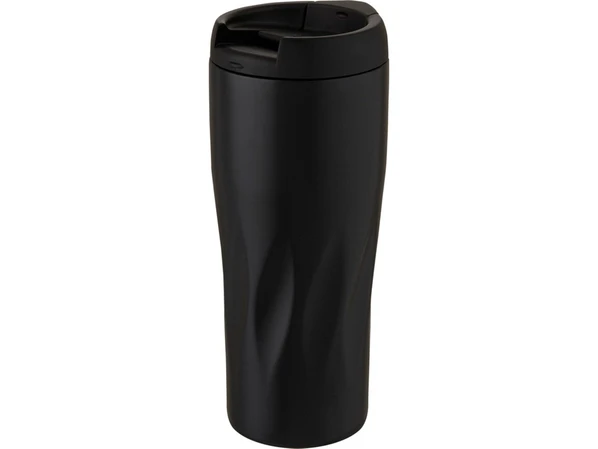 Черная термокружка с двойными стенками, вакуумной изоляцией и навинчивающейся герметичной крышкой с волнистым геометрическим дизайном.