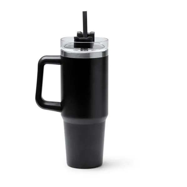 Стильная черная термокружка из переработанной нержавеющей стали. Крышка с трубочкой и винтовой системой закрытия. Вместимость: 870 мл.