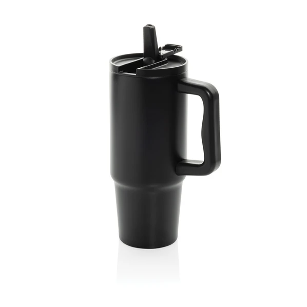 Черная термокружка объемом 900 мл сочетает удобство и вместительность: узкое основание подходит для большинства подстаканников, а удобная ручка обеспечивает комфорт при переноске.