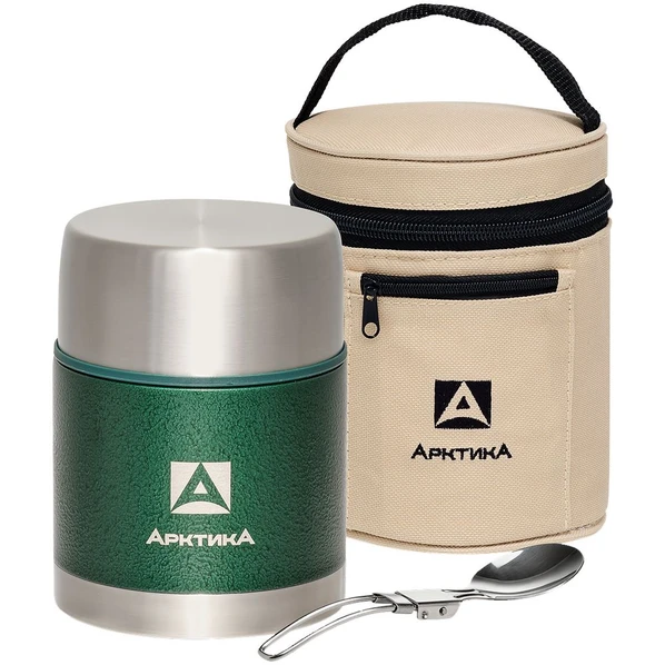 Готовый комплект для похода на природу: зеленый термос для еды с широким горлом и ударопрочным покрытием и легкая складная ложка в термочехле. Емкость 500 мл.