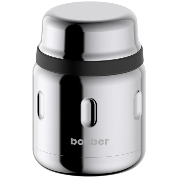 Серебристый вакуумный термос для еды со складной ложкой. В нем любимые блюда не соприкасаются с пластиком и остаются горячими надолго.