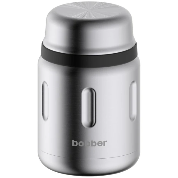 Серый вакуумный термос для еды со складной ложкой. В нем любимые блюда не соприкасаются с пластиком и остаются горячими надолго.