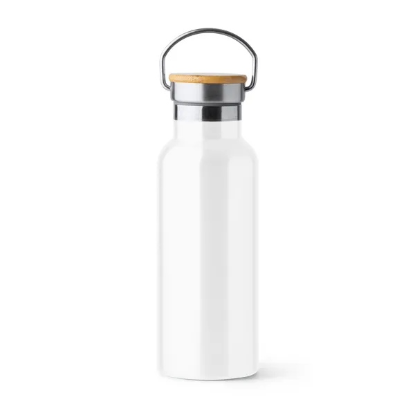 Стильный белый термос Tiset с двойными вакуумными стенками и бамбуковой крышкой. Емкость 500 мл. Возможность сублимации на белом цвете. Складная металлическая ручка.