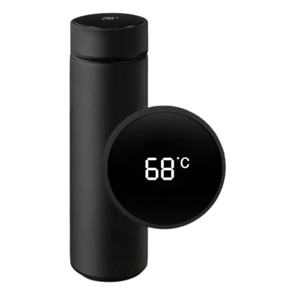 Металлический черный термос с двойными стенками и датчиком температуры. Внешнее покрытие — пудра (порошковая покраска) устойчива к царапинам и тактильно приятная. Термос обладает хорошей герметичностью и может сохранять напиток холодным или горячим в течение нескольких часов.