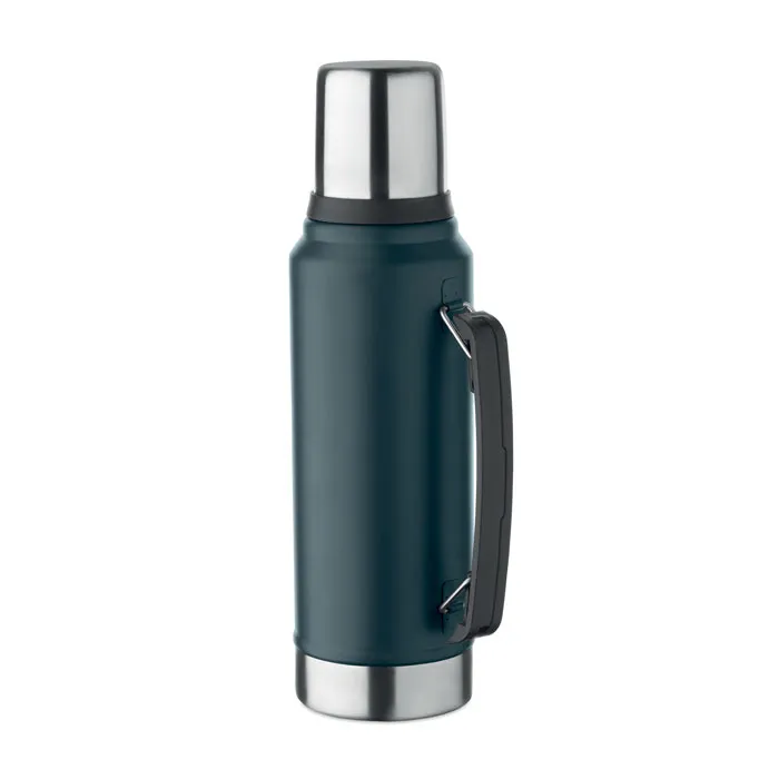 Вместительный синий термос с двойными стенками из переработанной нержавеющей стали 90% и 10% нержавеющей стали с боковой ручкой, крышкой из полипропилена и чашкой из переработанной нержавеющей стали.