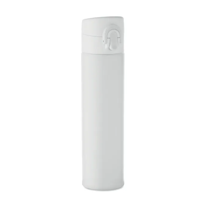 Компактный белый термос с двойными стенками из переработанной нержавеющей стали 90% и 10% нержавеющей стали с замком от проливания на крышке и опцией нажатия для открытия.